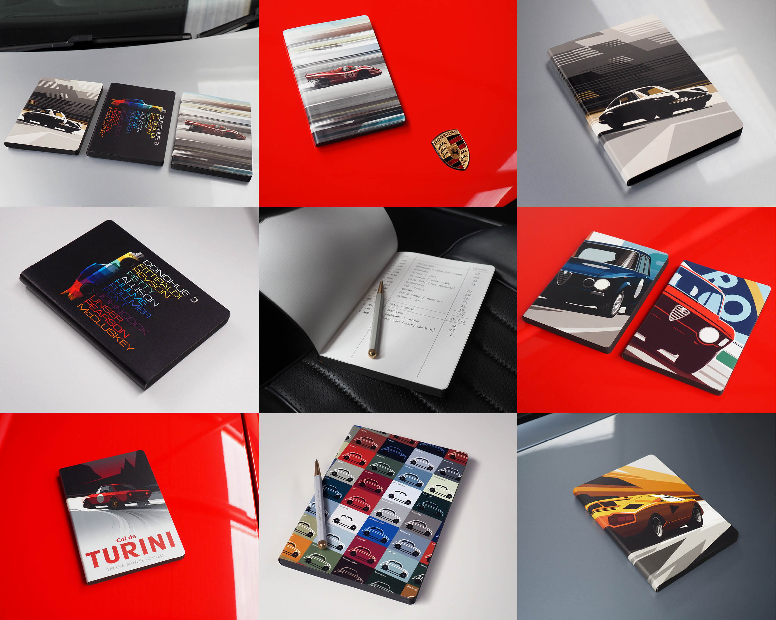 Acht hochwertige Notizbücher, die in Zusammenarbeit mit dem gleichgesinnten Automobilkünstler Guy Allen entwickelt wurden – jedes von seinen Originalvorlagen reproduziert.
