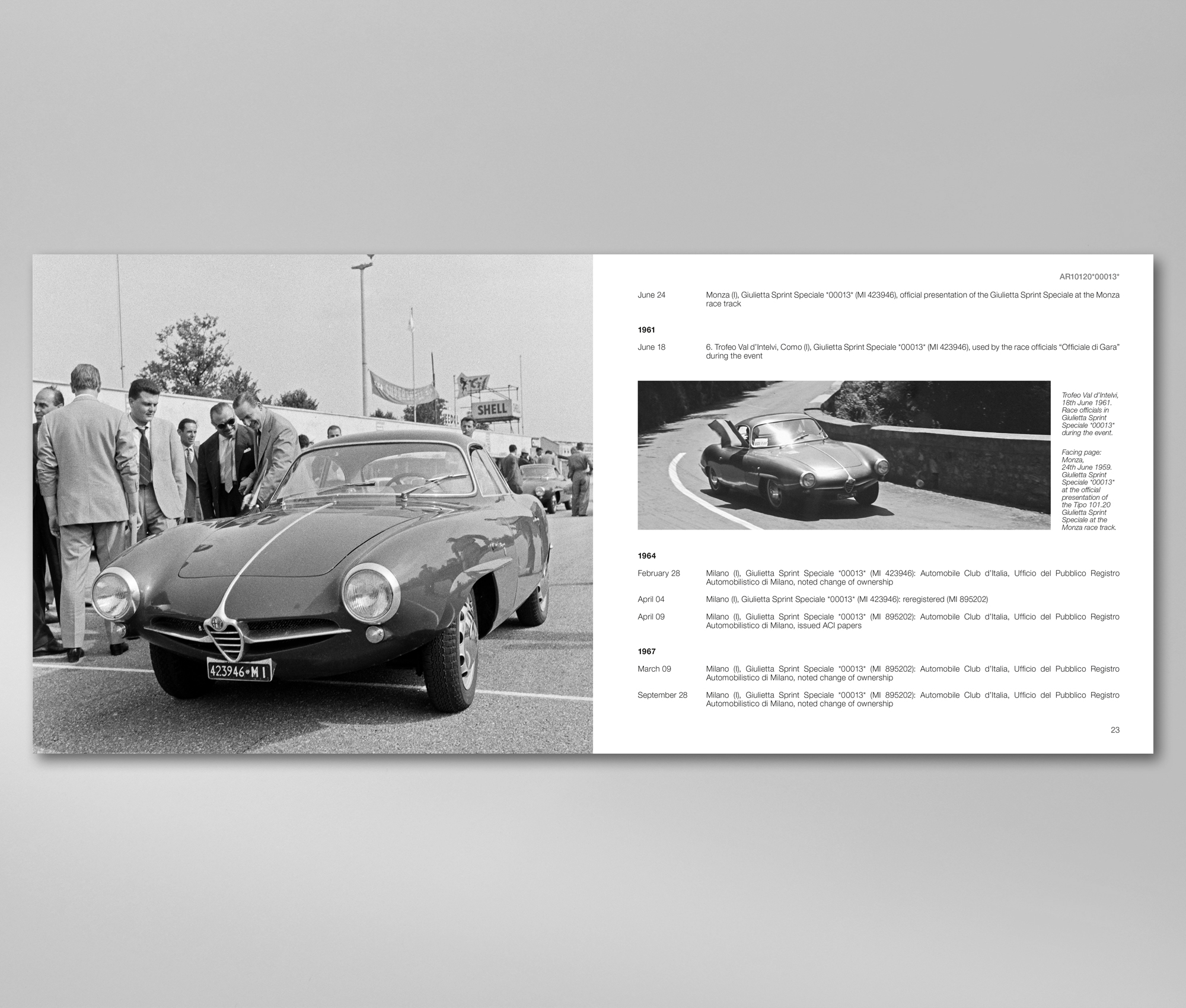 Der zweite Band ist ein vollständiges Register der ersten 101 gebauten Giulietta Sprint Speciale sowie von Fahrzeugen mit nachgewiesener Renngeschichte.