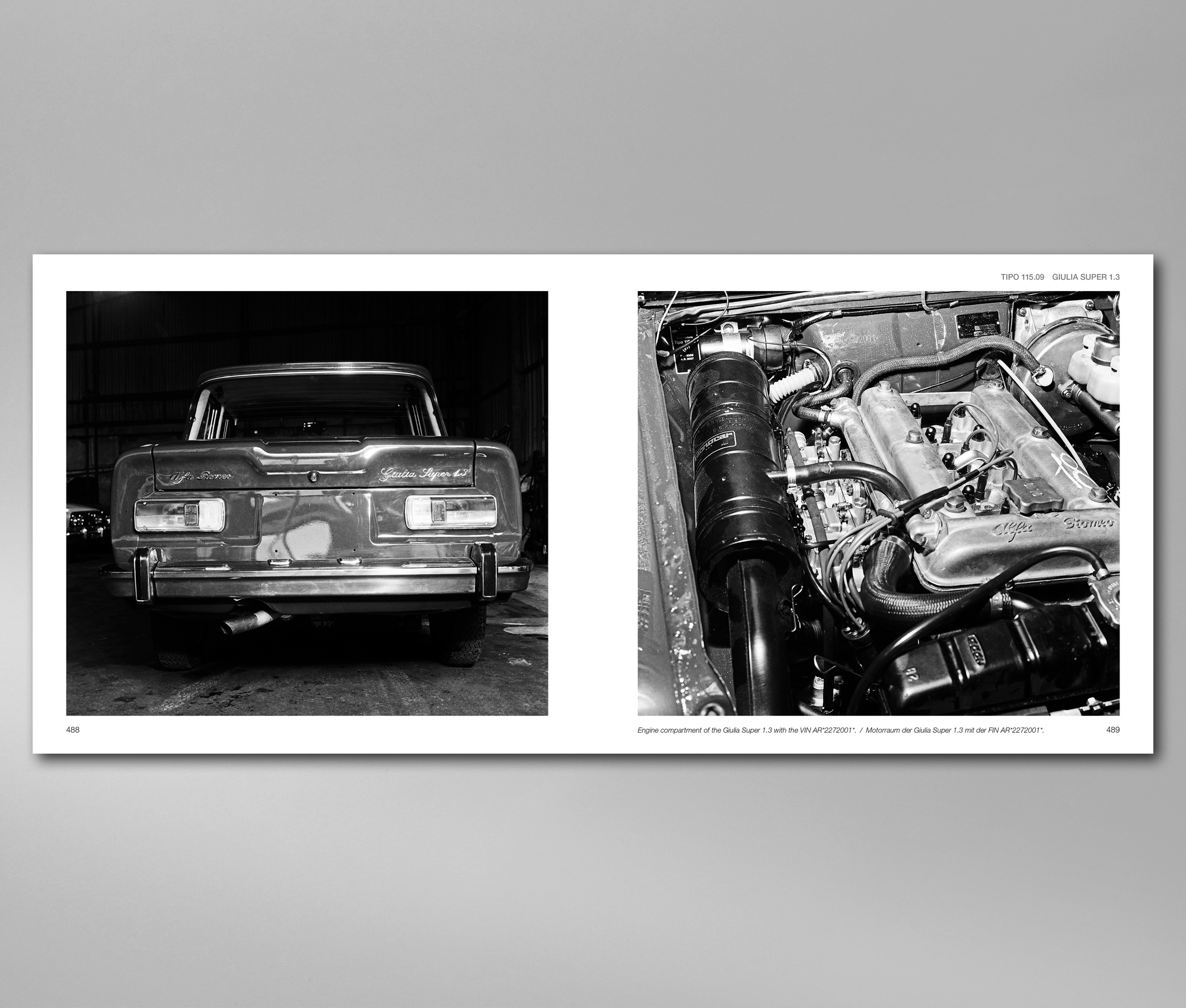 Alle sechs Bände sind zweisprachig in Englisch und Deutsch verfasst und hervorragend verarbeitet. Druck und Bildreproduktion erfolgen auf hochwertigem Mattglanzpapier in bester Qualität. Die Illustration des gesamten Buchwerks ist schlicht gigantisch. 2019 Fotos auf über 2200 Seiten lassen keinen Aspekt der Modellentwicklung der diversen Giulia-Baureihen unberücksichtigt. Es handelt sich ausschließlich um zeitgenössische Fotos aus den 1960er und 1970er Jahren, die ein unglaubliches Maß an Authentizität vermitteln. Dementsprechend überwiegen die Schwarzweiß-Aufnahmen, von denen ohnehin ein ganz besonderer Reiz ausgeht. Es ist deshalb auch kein bedeutender Mangel, dass einige der Farbfotos – offenbar bedingt durch ihr Alter – etwas rotstichig sind. Die Abbildungen sind zum großen Teil im ganzseitigen Querformat gehalten und spiegeln nicht nur den optischen Reiz der Alfa Romeo wider, sondern beleuchten auch sämtliche technische Details in einer Vielfalt und Genauigkeit, die ihresgleichen sucht. Ob Kühlergrill oder Kofferraum, ob Motorblock oder Unterboden, ob Armaturenbrett oder Türverkleidung, ob Bremsen, Rückbank, Pedalerie oder Vordersitze – praktisch alle wesentlichen und somit zur Unterscheidung der Baureihen geeigneten Merkmale werden erkennbar gemacht. Immer wieder begeistern natürlich die Aufnahmen, die die ausnahmslos optisch so reizvollen Alfa in ihrer Gesamtansicht vor abwechslungsreichen Hintergründen zeigen – auf Ausstellungen, in Landschaften eingebettet oder einfach auf dem Werksgelände.