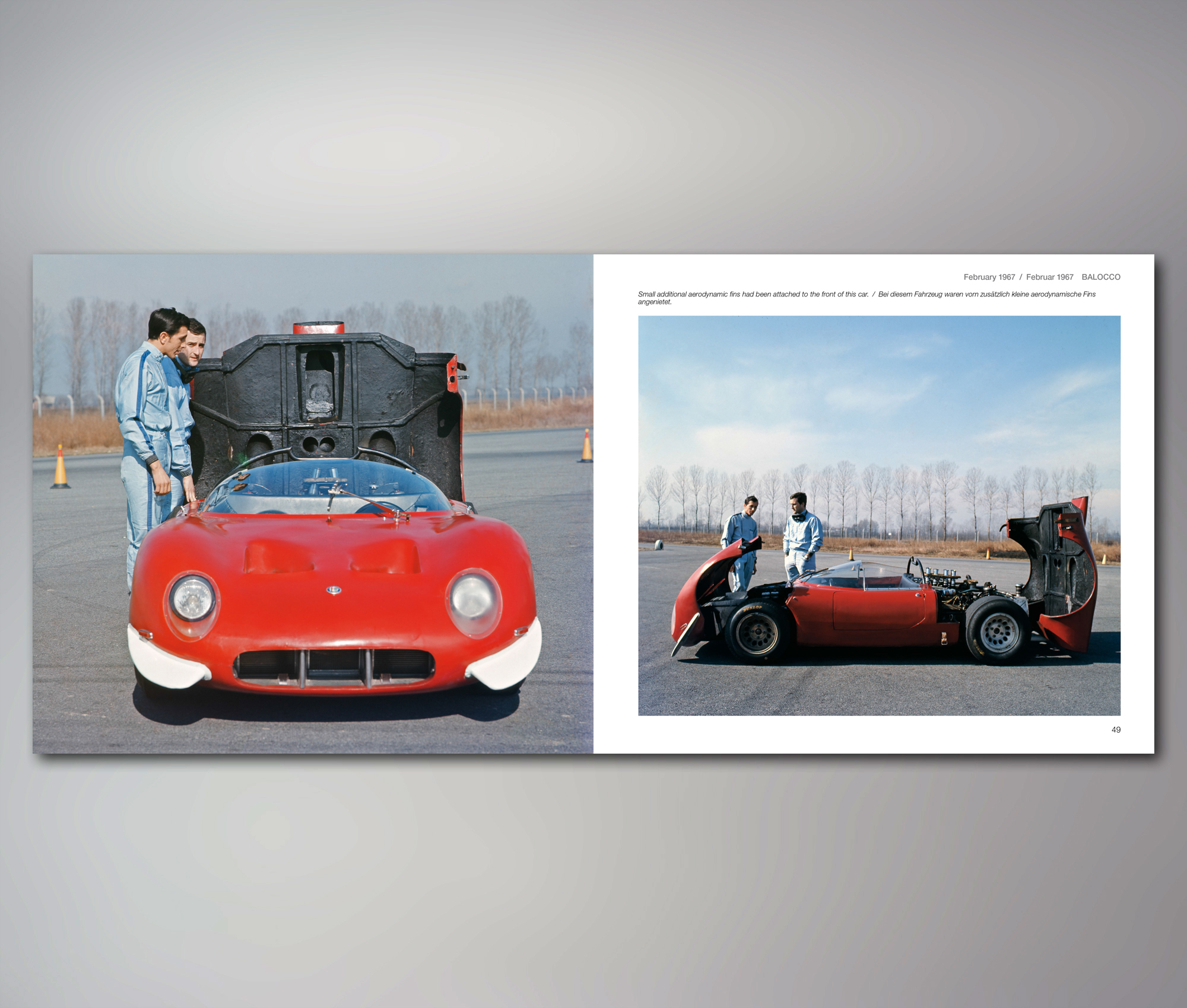 Die Autoren haben das ganze Jahr 1967 chronologisch dokumentiert, Renneinsätze, Testfahrten und Salonpräsentationen werden aneinandergereiht und mit vielen hochinteressanten Bildern in S/W und Farbe ergänzt. Vor allem die vielen Bildern von kleinen Details sind beeindruckend. Die Texte sind kurz, aber informativ, bei den Bildtexten hätten wir uns gewünscht, dass deutsch und englisch besser getrennt sind. Das Verfolgen der Modifikationen an den Autos von Termin zu Termin macht richtig Spaß, wenn man sieht, wie die Kühlprobleme beim Rennen von Mugello im Juli auf relativ brutale Art mit der Säge bekämpft wurden, merkt man, wie früher improvisiert wurde.