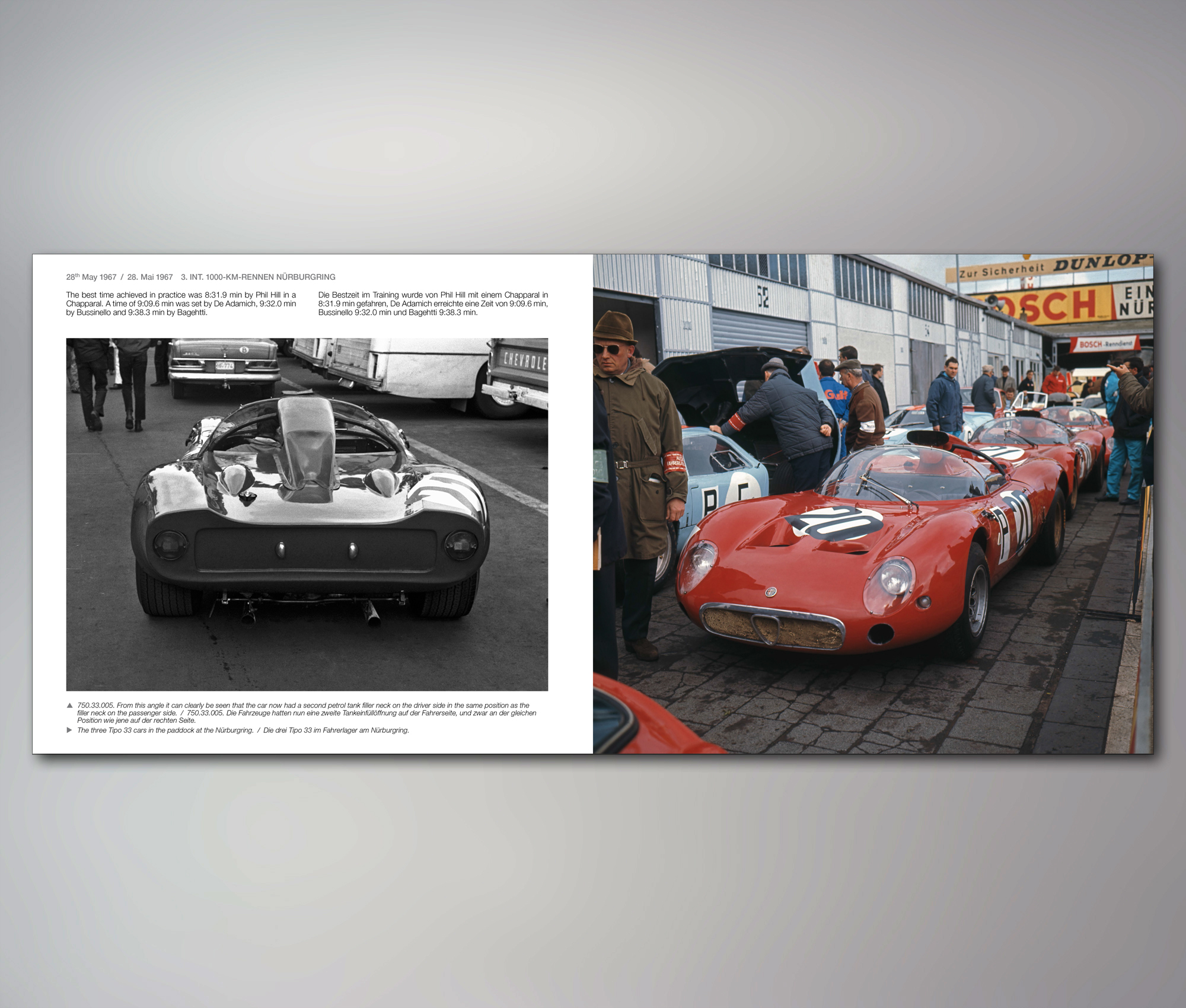 In minutiöser Arbeit im Alfa-Romeo-Werksarchiv konnte die Geschichte der Werkseinsätze des Tipo 33 in allen Details eruiert werden. Die Saison 1967 wird in diesem 312 Seiten starken Band präsentiert, das Jahr 1968 wird vermutlich noch heuer erscheinen. Den Tipo 33 Stradale und den Alfa Romeo OSI Scarabeo gibt’s sozusagen als Draufgabe.