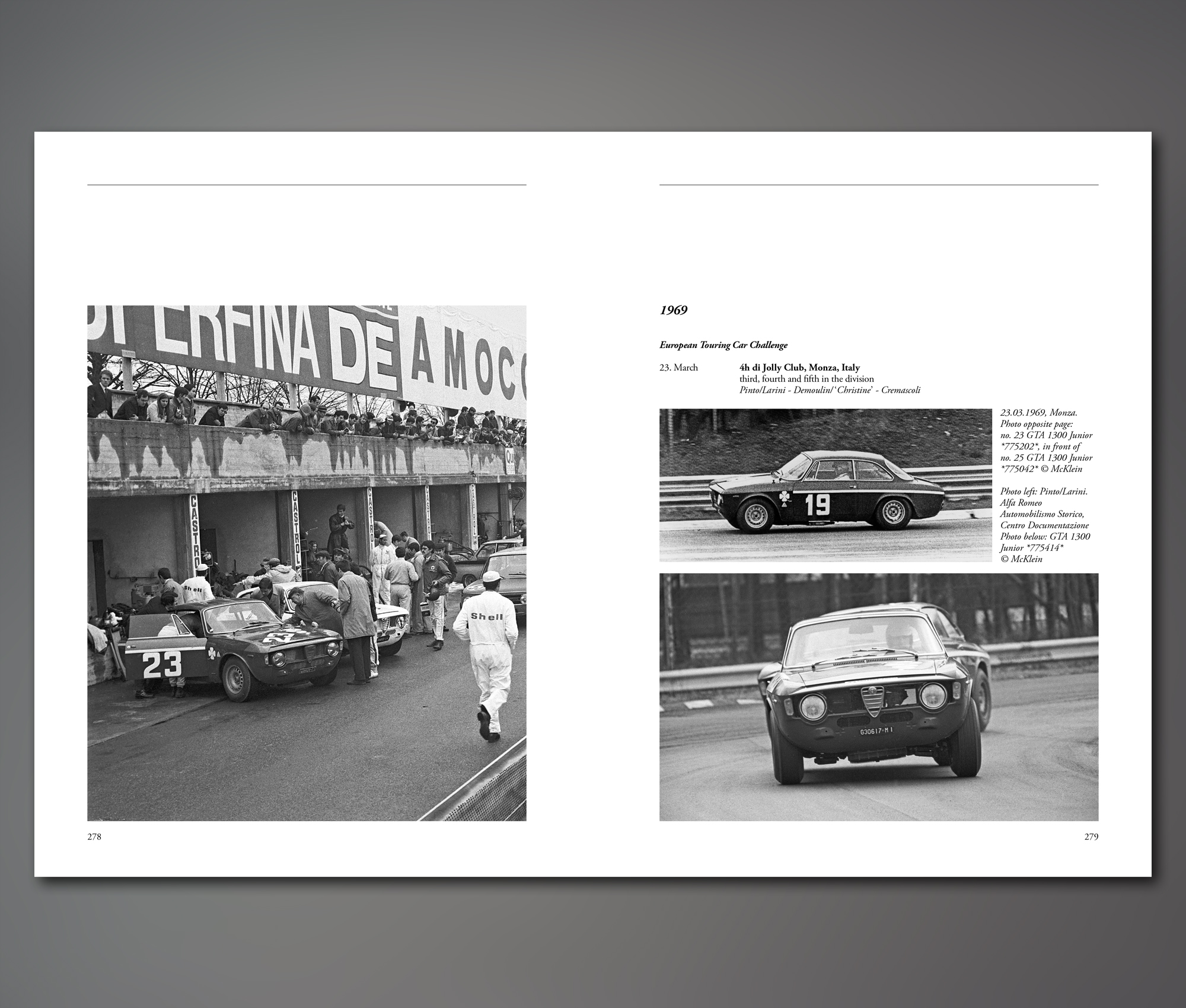 Band 1: "Alleggerita" handelt von der Entwicklungsgeschichte der Alfa Romeo GTA / GTAJ / GTAm und deren Renngeschichte mit einem Hauptfokus auf die Europäische Tourenwagen-Meisterschaft.
