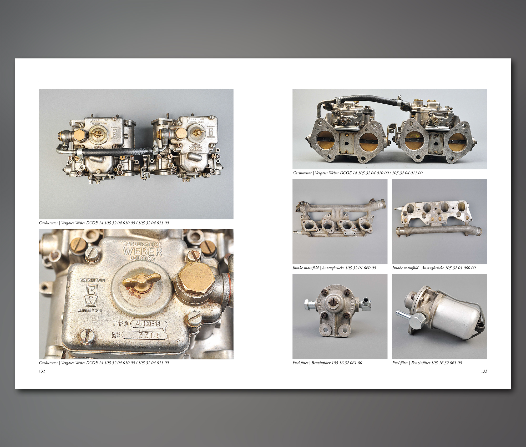 Vol. 2 will now definitely remind you that you really wish someone had explained who the people behind this book are. What makes them tick?? Why go to such extreme lengths?? This volume is full of source material, meaning reproductions of internal Alfa Romeo material such as homologation files for the various models, reproduced in their entirety, full size (you’ll want to brush up on your Italian), and even the extensions to homologation reports that were required to document modifications. Then there are official tech documents covering everything from torque values to how to align throttle valves – and all of this is in English because these came from a US source that created them on their own reconnaissance in the 1960/70s. And then the coup de grace: photos of every racing part ever produced. Well, there are some gaps, but hope springs eternal that one day every last O ring will have been photographed. Alfa Romeo never bothered to create an in-house catalog and this sort of knowledge used to reside only in the heads of parts and service guys. (In fact, dealers everywhere were expected to have someone on staff who spoke enough Italian to be able to communicate with Autodelta!) Restorers will wear out this volume for sure, although it should be realized that using surviving paperwork to assign parts to specific years of production can be hampered when record-keeping in period (or reconstructed later) was not in synch with real-time practice in the field/shop floor.