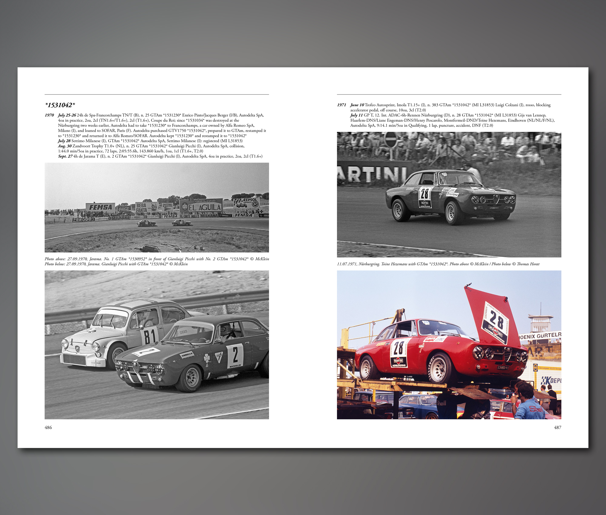 Vol. 3 is conceptually the most normal: a registry of known and confirmed GTA/GTAJ/GTAm chassis, in numerical/chronological order (but subdivided into models). Those that had competition history have it enumerated by date/event/result. The cutoff is 1981, the year the last homologations expired. The chief data wrangler here is Martin Übelher who had been gathering such info for decades. Also, all sorts of heavy hitters in the Alfa club world have been involved and consulted. All sorts of useful bits are appended: motorsports governing bodies and their classes/groups, abbreviations, an English/German glossary, and a bibliography. If you find the set second-hand, be sure it includes the two loose supplements of a reproduction Giulia Sprint GTA manual and the handbook insert for the GTA 1300 Junior, as well as an errata sheet. The set number should be stamped on the box (this is not a clamshell or slipcase but a carrying/storage box with handle) which should have a cloverleaf sticker. Tony Adriaensens likes to say his books “have never disappointed anyone, they’re all extraordinary!” Before you dismiss that as an idle boast, consider that all but one of his six frightfully expensive books have sold out. And as to Patrick Dasse, one can only wish we would blow his horn more! Won a 2013 German Automobile Club (ADAC) “special award.”
