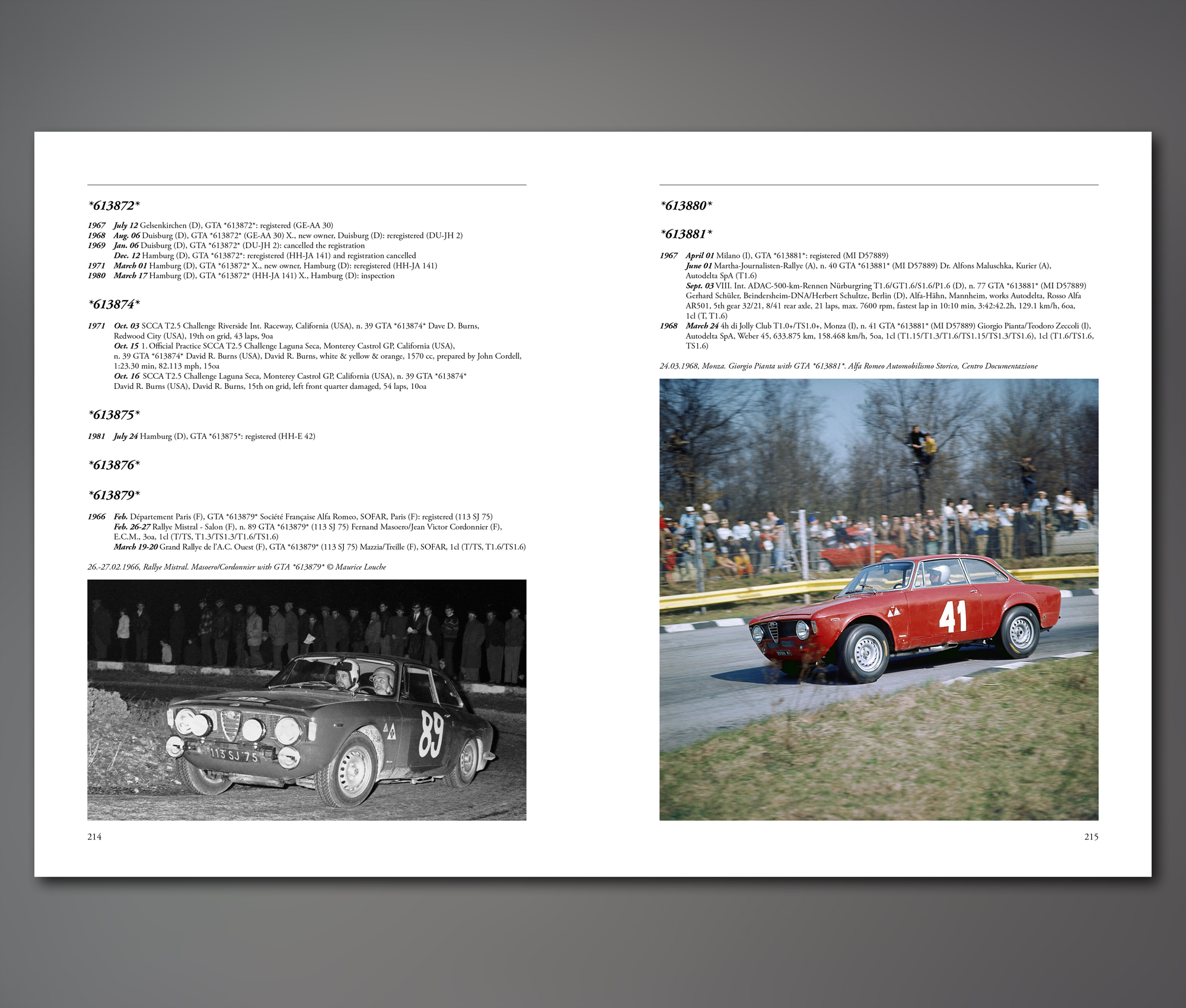 Alleggerita means lightened in Italian, so that GTA or GT AIIeggerita stands for lightened GT. As the courier staggered to my front door with two copies, one for my brother, the other for me, I remembered that the quoted weight for a copy was somewhere approaching 8.5 kgs. This is definitely not a lightweight publication. This new revised edition comes in three volumes. The first volume, some 460 pages, is the story of the development and the racing, of the 1600 GTA, the 1300 GT Junior, the 1300 GTA Junior and the GT Am. The second volume, another 460 odd pages, covers documentation and pictures of the genuine parts that make up these special Alfas. The documentation includes homologation form copies and much original data. The third volume, over 520 pages, carries a Register of the cars known to have been built, with histories where available and sufficiently certain to be publishable. Patrick Dasse tells me that what is published is about a third of what they have to hand but validation is an important part of the process. So, if you are lucky, your GTA may be shown with its early competition and/or ownership history. A line has been drawn at 1981, the year when the last homologation of these cars expired. You will get the picture, that this is not a lightweight exercise, especially as the 1450 pages are nicely printed on heavy quality paper. The first edition, by Tony Adriaensens, was published as a single volume back in 1994 by Tony’s Corsa Research operation in Holland. I was lucky enough to come across Tony at a race meeting that year, I think Zandvoort, took a deep breath and got Tony to sign a couple of copies for my brother and me. I have never regretted the purchase for a moment. His first edition was a refreshingly original piece of work from information and knowledge he had picked up from his travels and visits over many years, with quite a lot from a Benelux perspective. Alfa Romeo Benelux had always been an enthusiastic supporter of Alfa competitors, not least because the blue riband touring car race, the Spa 24 Hours, took place in the middle of its territory. Over the years following that first edition of Alleggerita has become recognised as probably the leading book on GTAs, helped by its publication in English. Eventually out of print, good used copies were fetching anywhere up to £1500.