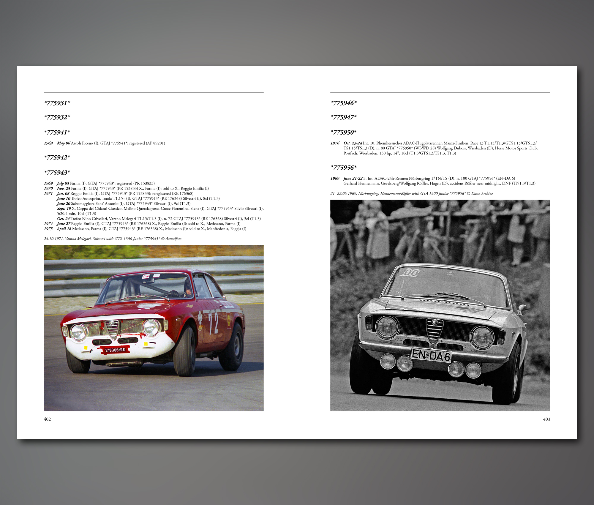 … bedeutet im Italienischen "leicht", was angesichts eines 7,7 kg schweren, dreibändigen Werks mit an die 1.500 Seiten als unpassender Titel empfunden werden könnte. "Alleggerita" bezieht sich allerdings auf das "A" des Alfa Romeo Giulia GTA, womit auch klar ist, worum es in dem monumentalen Werk geht. Vor mehr als 20 Jahren schrieb der Belgier Adriaensens die erste Ausgabe des Standardwerks über die sportlichen Tourenwagen von Alfa Romeo und jetzt hat der Hamburger Sammler Patrick Dasse die Rechte erworben und das Werk in erweiterter und aktualisierter Form neu aufgelegt – aber das ist nur der erste Band. Band 2 enthält die technischen Unterlagen, Homologationsblätter und Abbildungen der einzelnen Bauteile. Der dritte Band schließlich ist ein – wiederum reich illustriertes – Register aller Fahrgestellnummern mit – soweit bekannt – deren Schicksalen und Rennergebnissen. Wer nicht warten möchte, bis das Werk um ein Mehrfaches des Preises nur mehr antiquarisch erhältlich ist findet Bestellmöglichkeiten und alle Informationen unter www.dingwort-verlag.de.